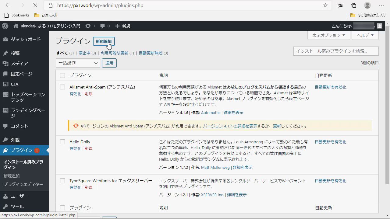 インストール直後に「Akismet Anti-Spam」・「Hello Dolly」・「TypeSquare Webfonts for エックスサーバー」の3つのプラグインがインストールされていることが確認できます。