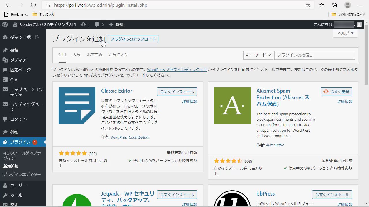 プラグイン画面で「新規追加」ボタンをクリックします。すると「プラグインを追加」画面に切り替わります。
