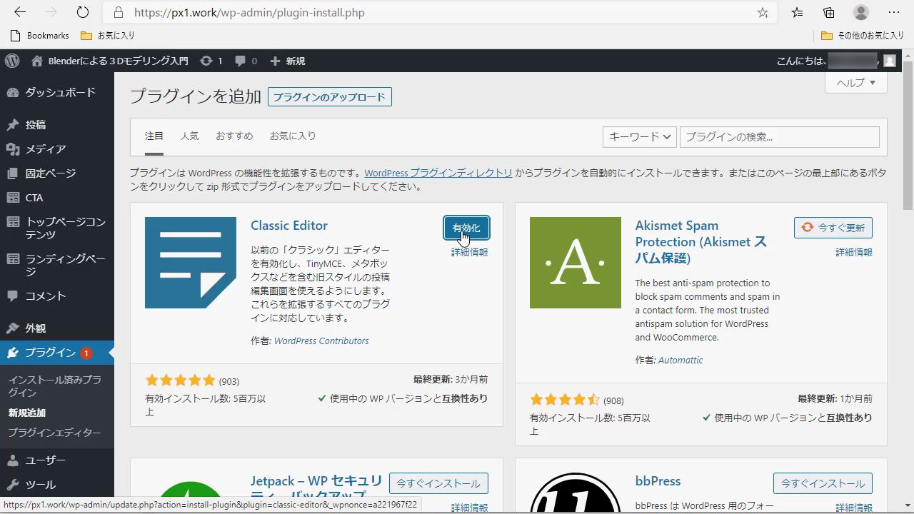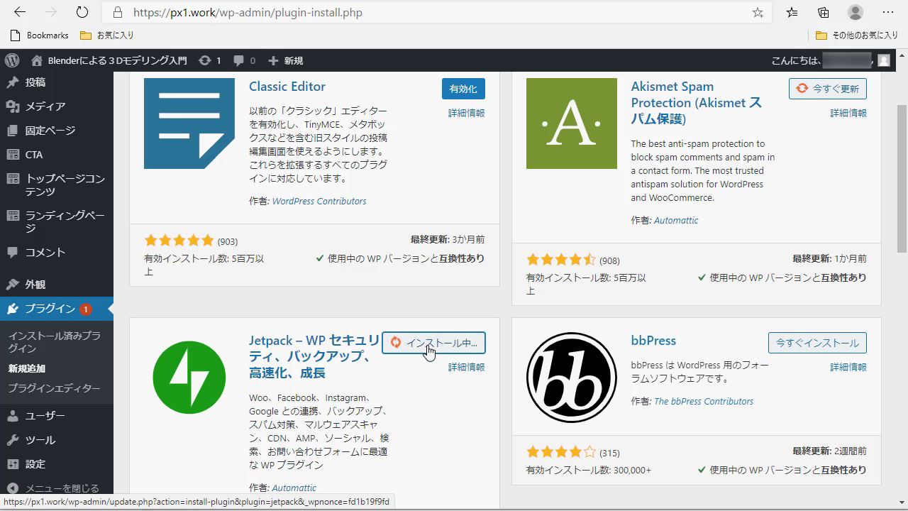 Jetpackプラグインは上でインストールしたClassic Editorの真下に表示されている。