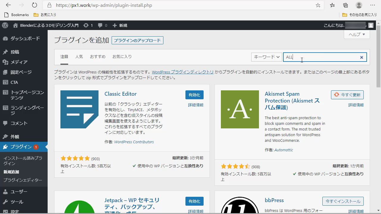 それでは新規にインストールしていきます。ただし順不同になります。なおプラグインのインストール後に、プラグインを有効化することでプラグインが利用可能になる。