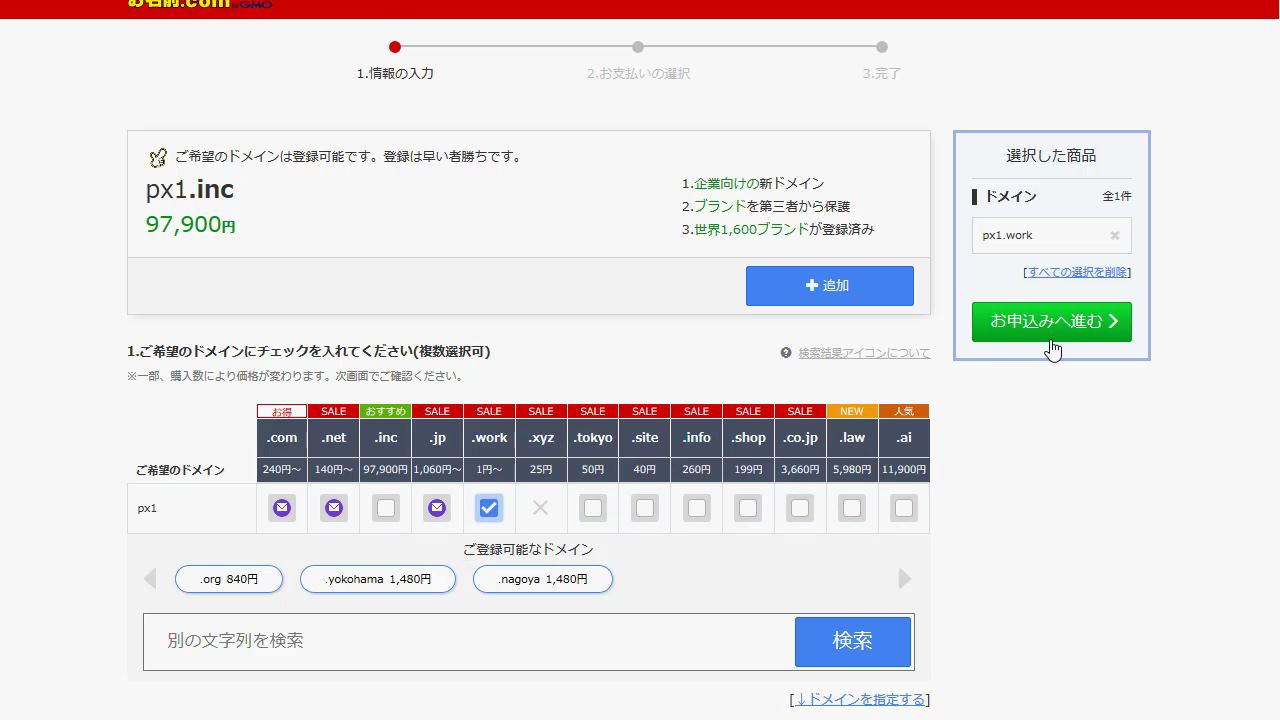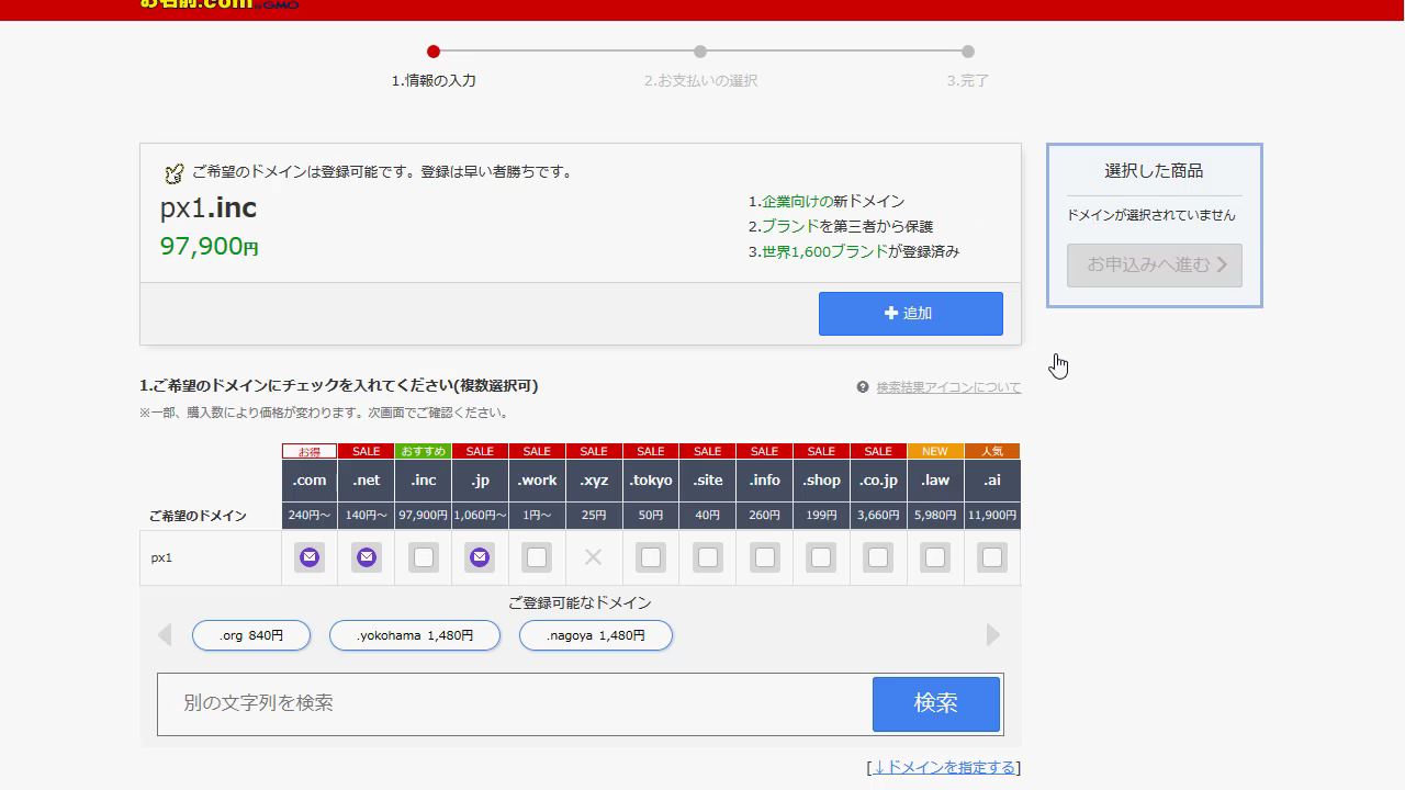×が記載されているドメイン(ここではpx1.xyz)はすでに取得されていることを示しています。