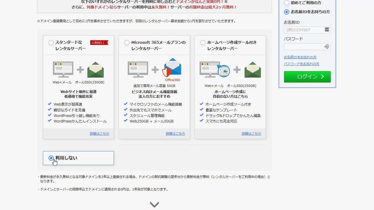 レンタルサーバーを申し込まない場合は、緑色の「ドメインのみ申込む」をクリックします。