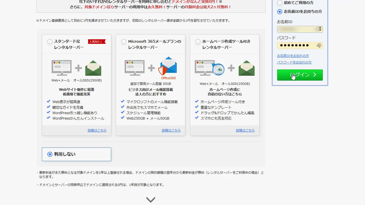 私の場合はすでにお名前.comに登録しているのでIDとパスワードを入力してログインすることで、上記の情報の再入力は省きます。