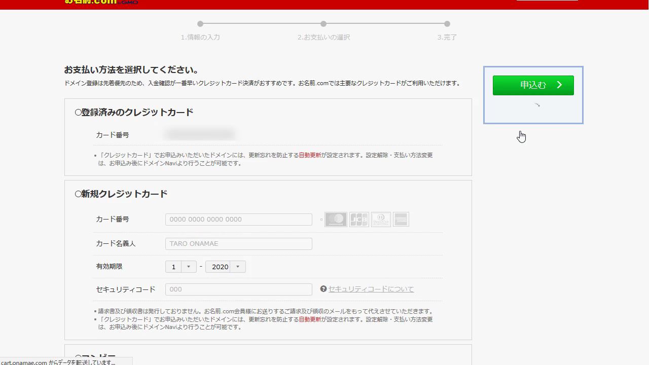 お名前.comでは、ドメインの購入に際して、クレジットカード、銀行振込み、コンビニエンスストア支払いが選択できますので、ご希望の手段を選択してください。