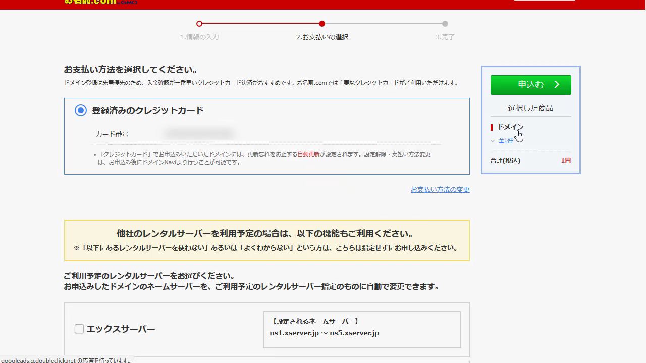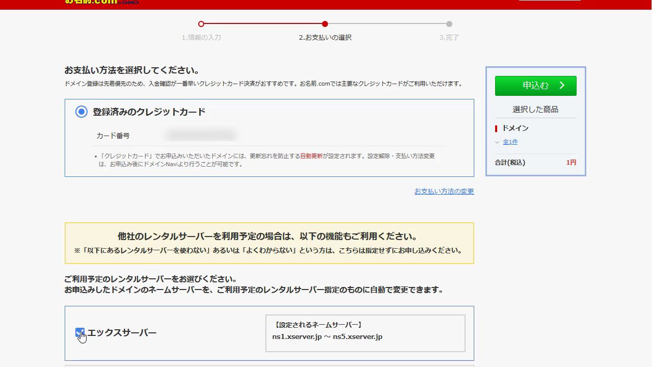 今回はエックスサーバーで利用する予定なので、ここにチェックを入れて右上の「申込む」ボタンをクリックします。