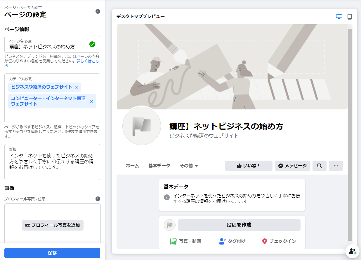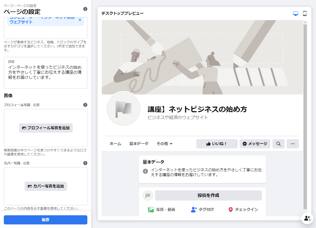 最後にプロフィール写真やカバー写真を設定して、「保存」ボタンを押せば作成完了だ。