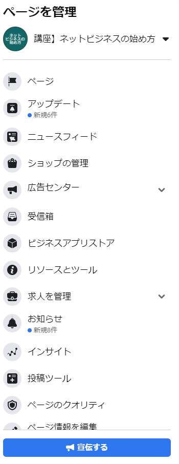 Facebookページの管理ページに移ると左側にメニューが表示される。