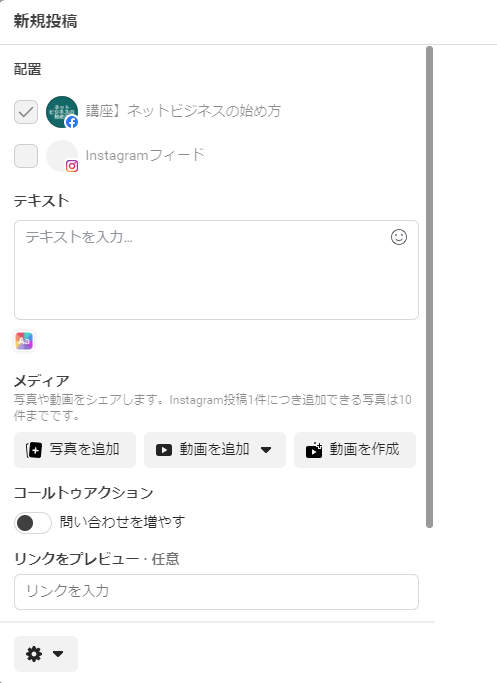 記事の投稿は、Facebookページ内の「投稿の作成」ボタンをクリックして行っても良いし、画面左のメニューから「投稿ツール」を使っても良い。「投稿ツール」の方が使い勝手は良いので推奨する。