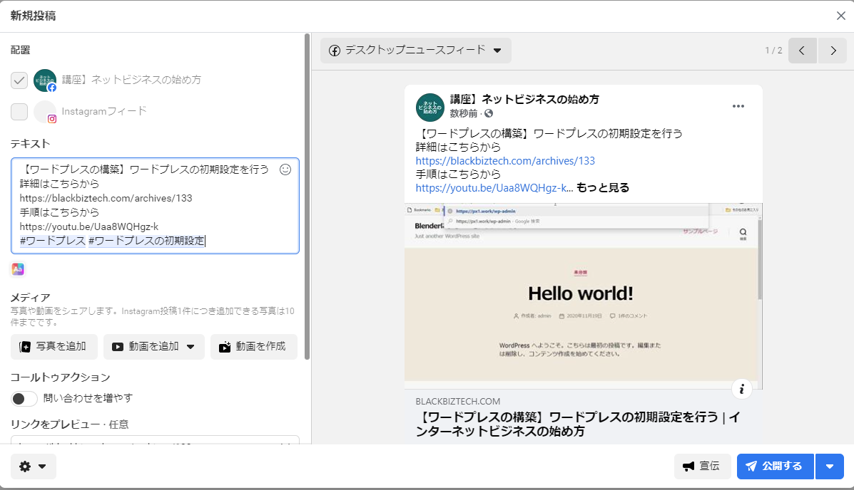 Facebookページにどのような記事を投稿するのかと言えば、基本的にワードプレスブログへの誘導を行う記事を投稿する。