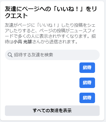 友達の右側に「招待」ボタンがついているので、それをクリックすることで友達にFacebookページの招待がアナウンスされる。
